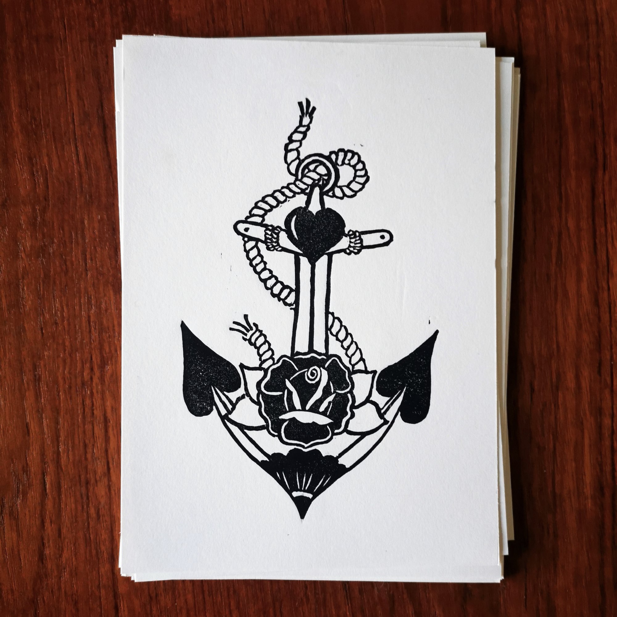 Take home a lovely print of my anchor and rose linocut! This is hand printed on 120gsm Kent Paper with Cranfield safe wash black ink. Sold unframed.